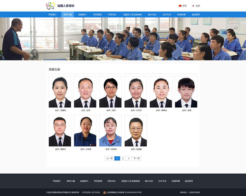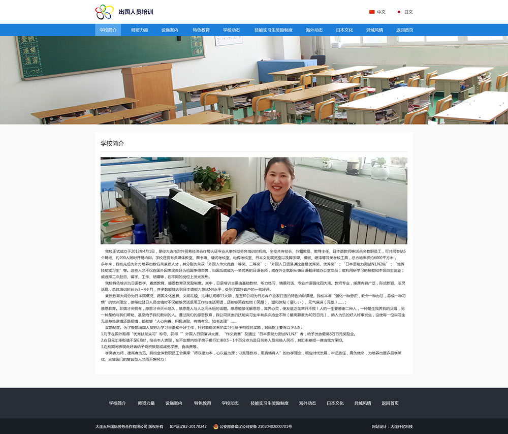 我校正式成立于2012年4月1日,是經大連市對外貿易經濟合作局認證專業從事外派勞務培訓的機構。全校共有校長、外籍教員、教導主任、日本語教師等10余名教職員工,可共同容納5個班級、約200人同時開班培訓。