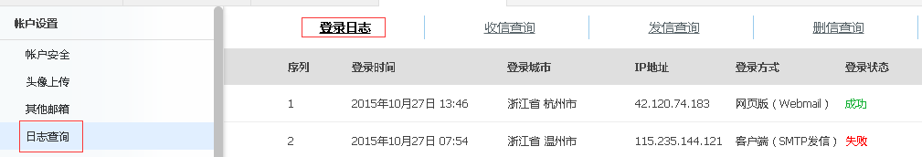 登錄郵箱后點擊右上角“郵箱設置”,在左側展開設置功能列表中點擊“日志查詢”即可查看,最多可顯示200條近30天內的登錄日志。