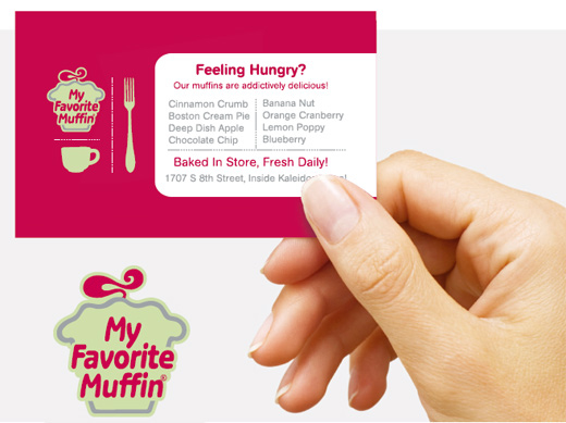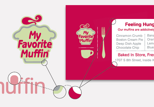標志其實說不上有多糟糕:雖然這個標志也說不上有多精彩,但對于一個餐飲標志,My favorite Muffin(我最愛松餅)老實說并不太差。它有一個簡潔(或者說一個讓人熟悉的)的構造,其名字較長,但形成了居中擺放使其成為一個焦點元素,還有一縷香氣飄在上方。字體充滿圓滑,與松餅的產品氣息也挺配合。但它的顏色卻有問題,但顏色我們可以通過在設計中修正。