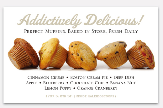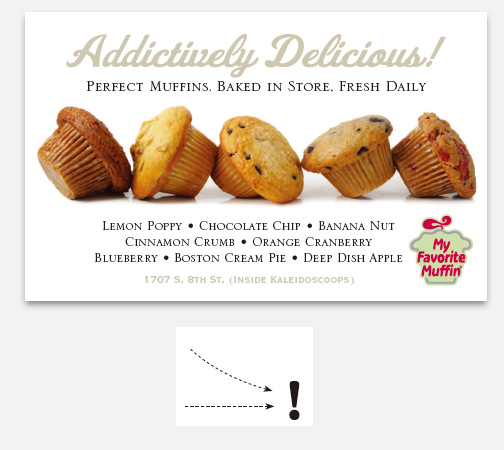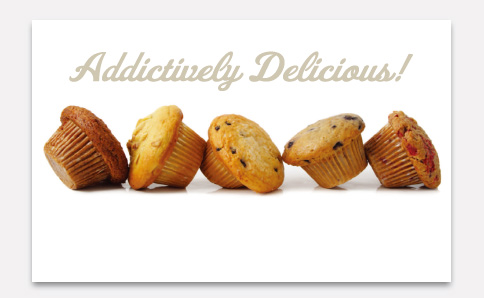 圖片占據版面的1/3高是恰當的,中間的位置也是版面中最有力量的區域,能夠最大程度吸引別人的興趣。留意松餅的陰影及倒影使松屏象放置在名片上,有很強的真實感,一如你那些放在餐臺上的松餅一樣。