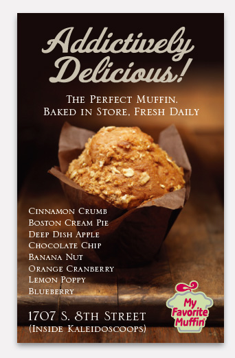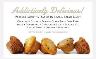 溫馨:在上圖中,白色的版面已經被棕色的圖片所代替,整個版面讓人感覺香氣四溢。在這個設計中,將圖片簡單地作為背景使我們能夠在設計中更加輕松,但其局限是其余的空間比較局促,使到松餅名稱也要重疊在產品上,一般不推薦這樣做,但這次,只能說基本還可接受了。
