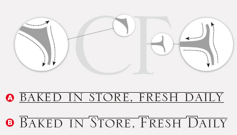 我們采用Serlio字體作為補充的文字字體,這種字體細看線條并不規則,充滿襯線,顯得復雜及懷舊,但同時也具有一種溫曖的感覺。這些字體最開始時手寫形成的,所以沒有直線及規則的轉角。我們采用細體,與標題那種粗壯小寫字母形成恰當的對比。上圖中,A:全部設為小寫字母(這種字體小寫字母也是以大寫字母形式出現,但尺寸相對于大寫字母來說較小),其整體邊緣性過于平滑。B:首字母設為大寫字母,使其形成一些不規則的輪廓。