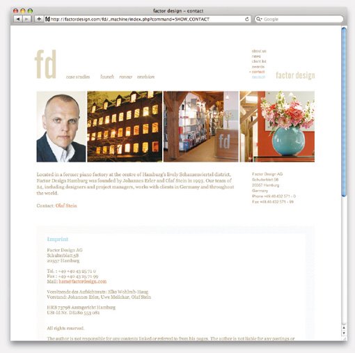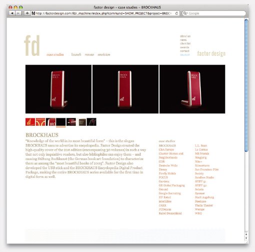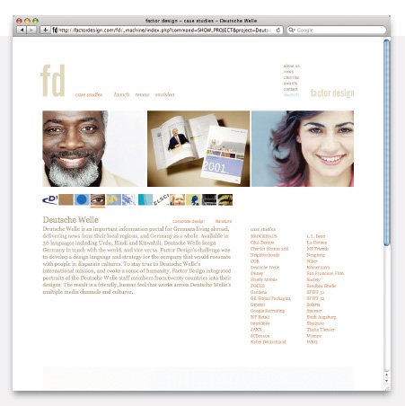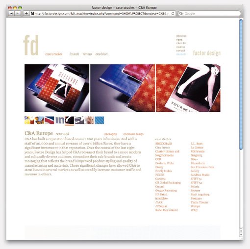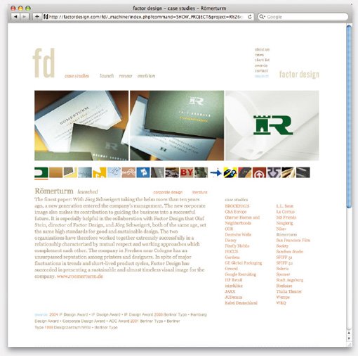 Factor Design網站令人一見難忘,其版面結合了作品展示及手冊設計的特點形成漂亮的效果。白色的開闊區域,高度簡潔及最小化的構成,柔和的顏色搭配,通過一些隱藏的表格整潔清晰地呈現出來。