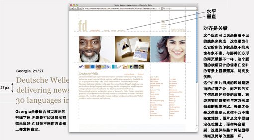 這個版式結構我們有兩點是特別欣賞的:一是它采用了印刷類的平面設計風格,使用襯線字體,文字顏色對比低調柔和,不同文字欄寬度形成強烈對比。二是上面的水平圖片區域設計,使整個版面顯得優雅漂亮。這個圖片區域只看上一眼,你可能不能一下子認識它的所有優點,但我們之所以深入討論這個區域是因為如果從技術上來說,你采用了同樣這種方法,就可以得到同樣漂亮的相似效果――無論是網站設計還是其它平面設計。看一下我們能夠從這個網站設計中學到什么。