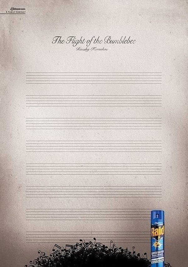 這個Raid殺蟲劑的廣告,用 產品“殺死”了著名音樂家——Rimsky-Korsakov譜寫的“大黃蜂飛行”的音符(把音符比作擾人的蚊蟲),意味著Raid殺蟲劑足夠強大,可以消除任何蟲子。 這個廣告看似很荒謬,但是這種如此明顯的不真實會讓人覺得搞笑,而不是欺騙或誤導。