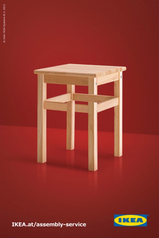 宜家通過在產品圖像上的一點巧妙修改,創造出了與潘洛斯三角形類似的又一“不可能”,以此來表現“困難”和“復雜”的概念,這也是他們對自家組合家具產品的自嘲。正如原來的潘洛斯三角形,這個廣告設計非常吸引人,通過在普通圖像上進行一點超現實改造,十分巧妙地讓消費者捕捉到宜家想要傳遞的消息。