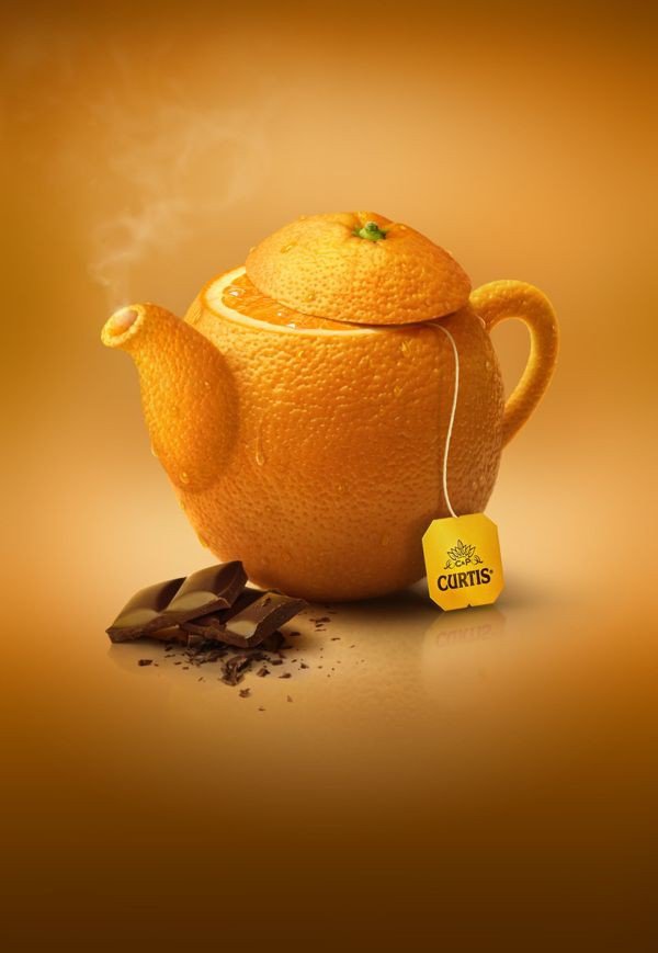 這個廣告由柯蒂斯茶選擇用視覺語言來展示他們的茶的香味和口感,而不是直接告訴顧客。 他們完全可以簡單地在頁面上添加一些文字說“這個茶擁有非常非常強烈的橙子香味”,但是他們選擇通過將橙子變成茶壺的形狀來傳遞以出他們的茶擁有非常強烈的橙子香味。
