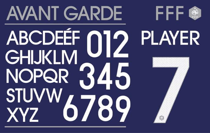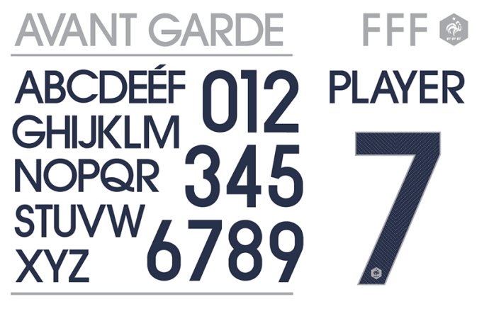 法國使用ITC avante garde的版本,在每個球員數字的底部都繡有法國圖標