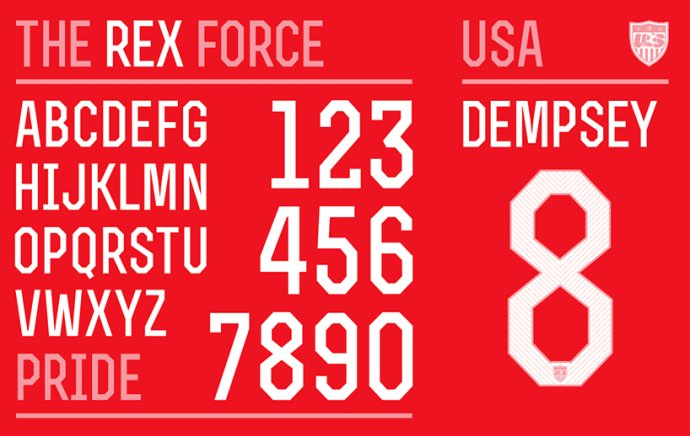 受美國運動球隊影響,美國球衣的名字和數字字體設計是現代風格且菱角分明的。球衣背部的每個數字下端也印有美國足球圖標
