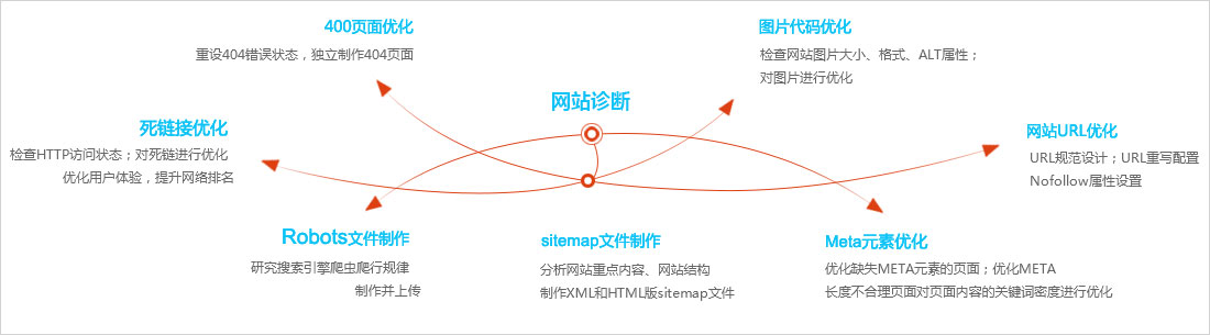 仟億網(wǎng)站優(yōu)化策略的實施包括死鏈接優(yōu)化、404頁面優(yōu)化、Robots文件制作,圖片代碼優(yōu)化、網(wǎng)站URL 優(yōu)化、Sitemap文件制作、Meta元素優(yōu)化七大網(wǎng)站優(yōu)化要素,傳悅從這七個 主要方面出發(fā),進(jìn)行多維度、網(wǎng)站優(yōu)化,七大要素互相關(guān)聯(lián),聯(lián)手往復(fù),流轉(zhuǎn)不息。